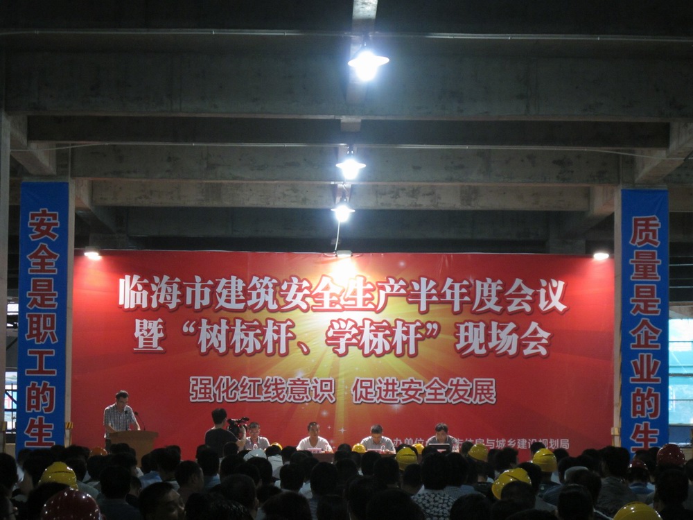 6月27日,圍繞“強化紅線意識、促進安全發(fā)展”的安全生產(chǎn)月主題,臨海市住房與城鄉(xiāng)規(guī)劃局組織在我集團公司承建施工的朗成大時代商住樓項目(2#、辦公樓、商業(yè)綜合樓)現(xiàn)場召開臨海市建筑安全生產(chǎn)半年度會議暨“學標桿、樹標桿”現(xiàn)場會,臨海市房屋建筑施工總承包企業(yè)的主要負責人、分管質(zhì)量安全負責人、監(jiān)理企業(yè)主要負責人、在臨施工外地企業(yè)分管質(zhì)量安全生產(chǎn)負責人及駐臨監(jiān)理企業(yè)負責人、在建工程項目負責人及項目總監(jiān)等近300余人參加了此次現(xiàn)場會。會議由市質(zhì)量監(jiān)督站站長葉青主持,參加會議的領(lǐng)導有市住建局副局長陳勇智、市安監(jiān)局副局長周邦春、市建筑業(yè)管理局副局長李春等。
